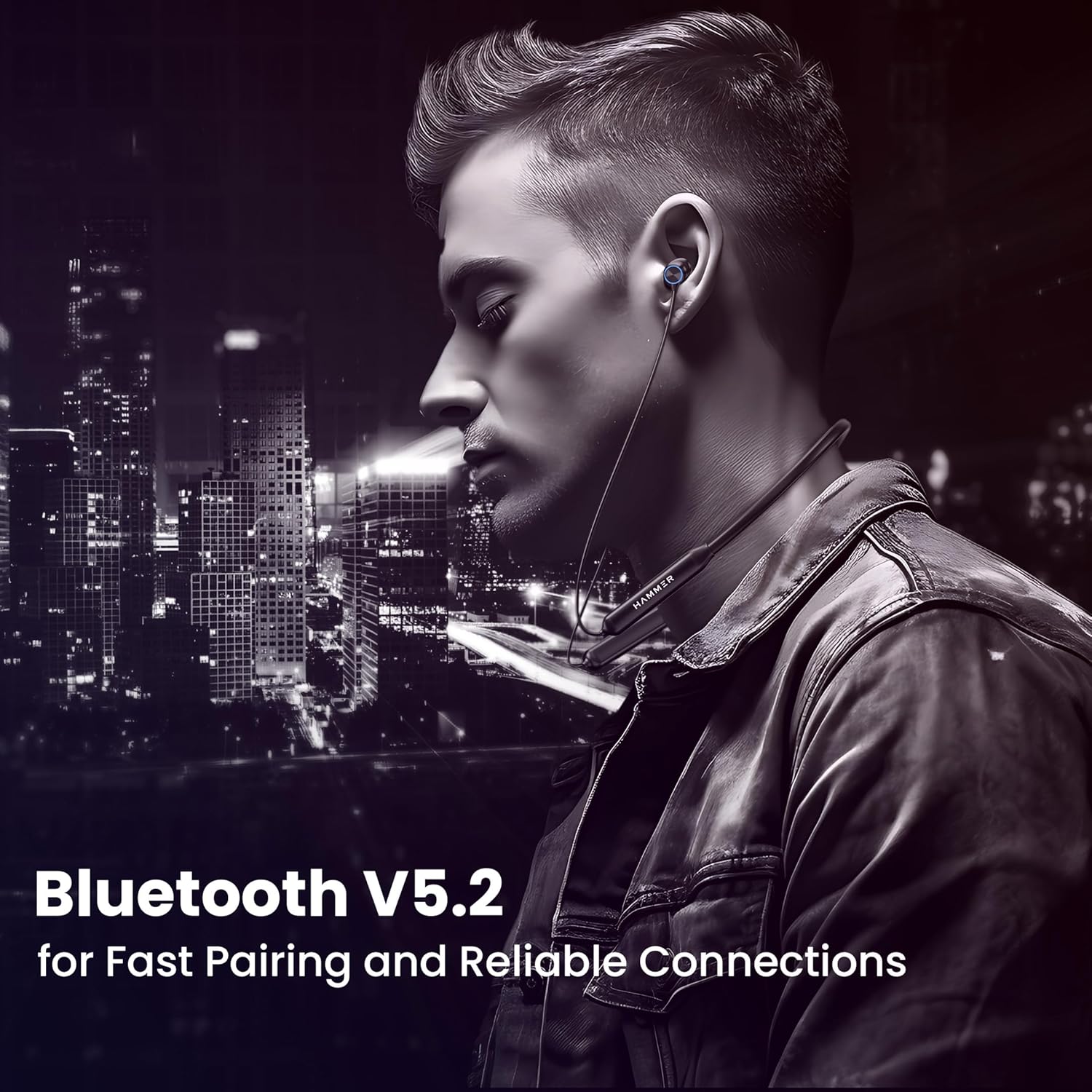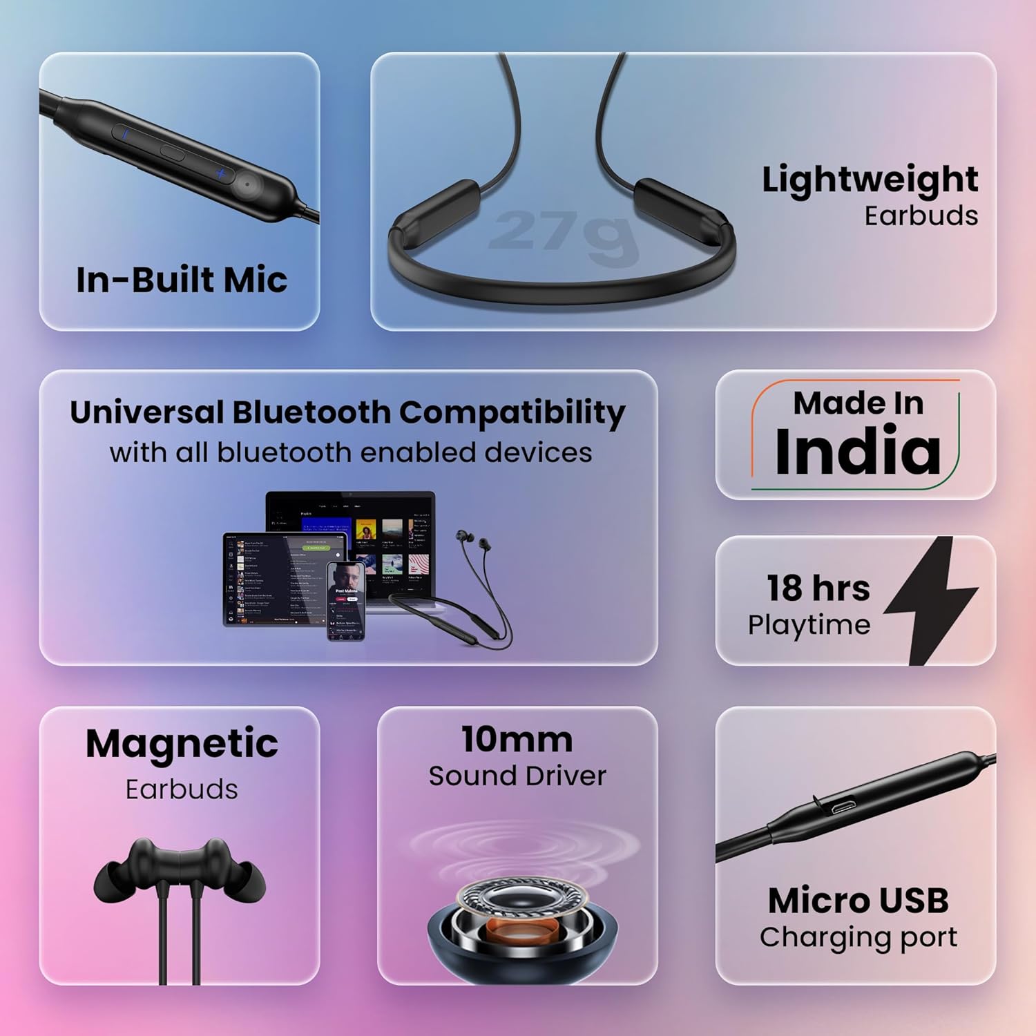 Wireless Neckband With Mic: In-ear wireless bluetooth neckband with built-in mic and 10mm dynamic driver that offers exquisite sound details and exceptional listening experience across various genres Magnetic Earbuds: Hammer Splendor bluetooth neckband earphones feature Magnetic Earbuds for hassle-free storage and quick access, ensuring tangle-free convenience whenever you need them Playback: Listen to your favourite music genres continuously for up to 18 hours with bluetooth earphones neckband extended music playback time, ensuring your favorite tunes accompany you throughout the day Deep And Loud Bass: Experience audio that resonates strongly, providing a rich and full-bodied sound with Hammer Splendor neckband earphones enhancing the overall audio experience with every beat Reliable Bluetooth Connectivity: Experience fast pairing and reliable connectivity with wireless neckband Bluetooth v5.2 technology for seamless audio streaming, while staying connected to your device at distances of up to 12 meters IPX5 Sweatproof: Our wireless earphones neckband boasts an IPX5 sweatproof rating, ensuring durability and reliability during intense workouts or outdoor activities, provides lasting protection against sweat, making it an ideal companion for your fitness journey Convenient Charging: A Micro USB charging port allows for easy and hassle-free recharging, ensuring your earphones wireless neckband is always ready to go